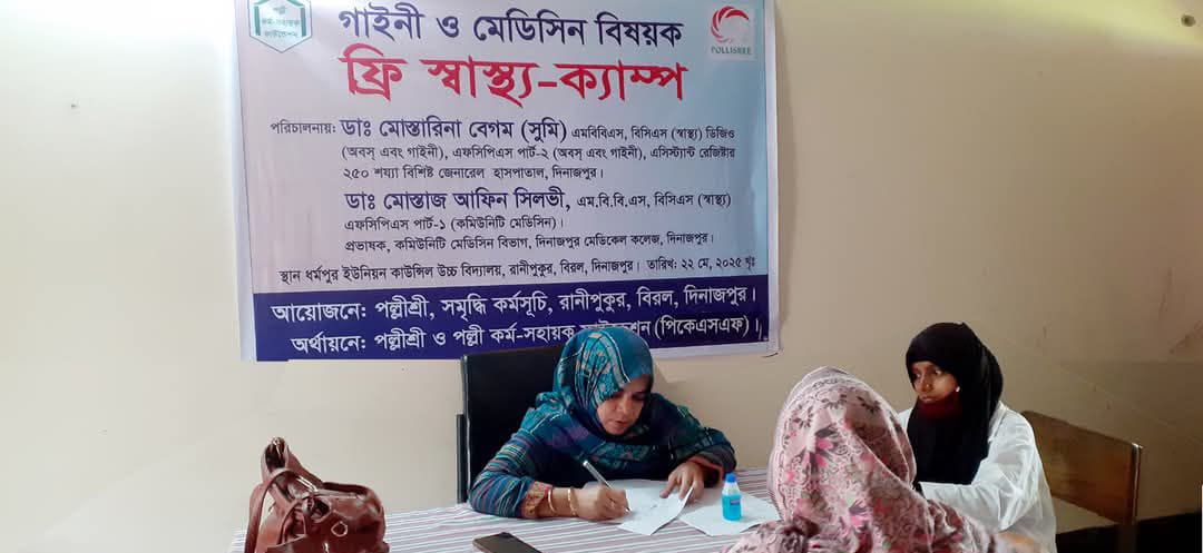 ২২মে,২০২৫ বৃহস্পতিবার পল্লী কর্ম সহায়ক ফাউন্ডেশন (পিকেএসএফ) ও বেসরকারি উন্নয়ন সহযোগি সংগঠন পল্লীশ্রী এর যৌথ অর্থায়নে পল্লীশ্রী-সমৃদ্ধি কর্মসূচির আয়োজনে বিরল উপজেলার রানীপুকুর ইউনিয়নের ধর্মপুর ইউনিয়ন কাউন্সিল উচ্চবিদ্যালয় প্রাঙ্গনে ফ্রি সাধারণ স্বাস্থ্য ক্যাম্প অনুষ্ঠিত হয়েছে।