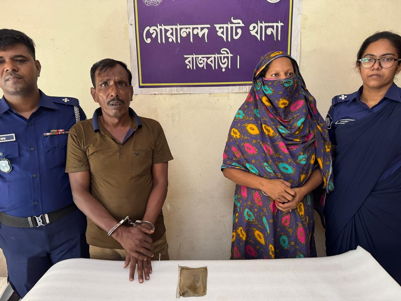গোয়ালন্দ ঘাট থানার অফিসার ইনচার্জ (ওসি) মোহাম্মদ রাকিবুল ইসলাম বলেন, থানার এসআই মোঃ সাইদুল ইসলাম সঙ্গীয় ফোর্স সহ দৌলতদিয়া ট্রাক টার্মিনাল এলাকা থেকে মাদক ব্যবসায়ী মুক্তা বেগম ও তার স্বামী জাহাঙ্গীর হাওলাদারকে হেরোইন সহ গ্রেপ্তার করে। এ ঘটনায় বুধবার গোয়ালন্দঘাট থানায় মাদকদ্রব্য নিয়ন্ত্রণ আইনে মামলা দায়ের করা হয়েছে।