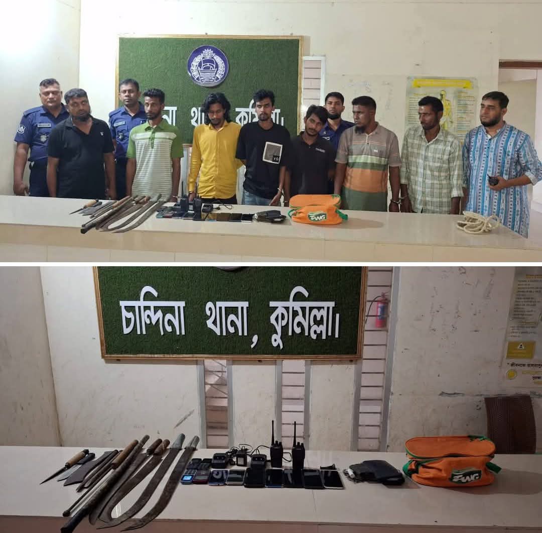 গোপন সংবাদের ভিত্তিতে কুমিল্লার চান্দিনা উপজেলায় ডাকাতির প্রস্তুতিকালে অভিযান চালিয়ে ৭ জন ডাকাতকে গ্রেফতার করেছে চান্দিনা থানা পুলিশ। এ সময় তাদের কাছ থেকে উদ্ধার করা হয় বিপজ্জনক দেশীয় অস্ত্রশস্ত্র।পুলিশ সূত্রে জানা গেছে, সম্প্রতি এলাকাবাসীর মধ্যে ডাকাতির আশঙ্কা বাড়ছিল। এই অবস্থায় একটি নির্ভরযোগ্য সূত্রের মাধ্যমে জানতে পারা যায়, একটি সংঘবদ্ধ ডাকাতদল বড় ধরনের ডাকাতির প্রস্তুতি নিচ্ছে। তাৎক্ষণিকভাবে চান্দিনা থানার অফিসার ইনচার্জ (ওসি) এর নেতৃত্বে পুলিশের একটি দল অভিযান পরিচালনা করে উপজেলার নির্দিষ্ট স্থানে। অভিযানে ডাকাত দলের সাত সদস্যকে গ্রেফতার করা হয়।গ্রেফতারকৃতদের কাছ থেকে উদ্ধার করা হয়েছে রামদা, চাপাতি, লোহার পাইপসহ বিভিন্ন দেশীয় অস্ত্র। পুলিশ জানিয়েছে, আটককৃতদের বিরুদ্ধে একাধিক থানায় ডাকাতি, ছিনতাই ও চুরির মামলা রয়েছে।চান্দিনা থানার ওসি বলেন, “আমরা ডাকাতির প্রস্তুতির তথ্য পেয়ে তৎপর হয়ে অভিযান চালাই। স্থানীয় জনগণের সহায়তায় অভিযানটি সফল হয়েছে। এলাকায় শান্তিশৃঙ্খলা বজায় রাখতে আমাদের এই অভিযান অব্যাহত থাকবে।”গ্রেফতারকৃতদের আদালতে প্রেরণ করা হয়েছে এবং বিষয়টি নিয়ে আইনানুগ ব্যবস্থা গ্রহণ করা হচ্ছে।এলাকার জনগণ পুলিশের এ ধরনের পদক্ষেপকে স্বাগত জানিয়েছে এবং আশা প্রকাশ করেছে যে, নিয়মিত এমন অভিযান চালালে এলাকায় ডাকাতি ও সন্ত্রাসীদের দৌরাত্ম্য হ্রাস পাবে।