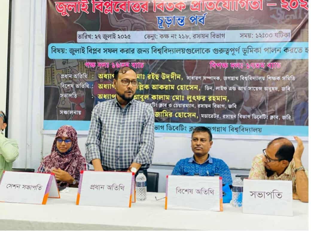 আজ রবিবার, ২৭ই জুলাই জগন্নাথ বিশ্ববিদ্যালয়ের রসায়ন বিভাগ ডিবেটিং ক্লাব কতৃক আয়োজিত জুলাই বিপ্লবোত্তর বিতর্ক প্রতিযোগিতার চুড়ান্ত পর্ব অনুষ্ঠিত হয়। এতে চ্যাম্পিয়ন হয় ১৭তম ব্যাচ ও রানার্সআপ হয় ১৬ তম ব্যাচ। বিজয়ী ১৭ তম ব্যাচ অর্জন করে টোটাল ৬৪.৩৩ পয়েন্ট অন্যদিকে ১৬তম ব্যাচ ব্যাচ অর্জন করে ৫৫.৯৯ পয়েন্ট এবং শ্রেষ্ঠ বিতার্কিক নির্বাচিত হন ১৭তম ব্যাচের দলনেতা মুজাহিদুল ইসলাম।