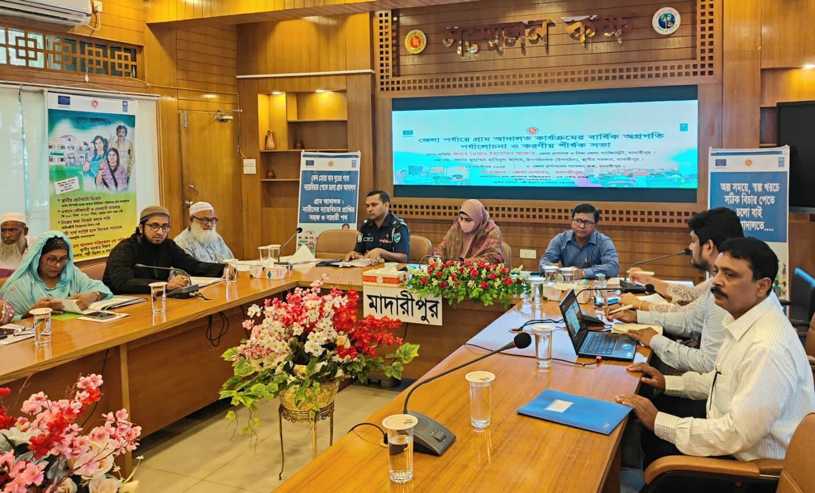 বিগত ১ বছরের মাঠ পর্যায়ের কার্যক্রমের পাওয়ার পয়েন্টের মাধ্যমে উপস্থাপন করেন মোঃ আলিউল হাসানাত খান, ডিস্ট্রিক্ট ম্যানেজার, এভিসিবি-৩ প্রকল্প। তিনি অবহিত করেন মাদারীপুর জেলায় ৫৯ টি ইউনিয়ন পরিষদে বিগত জুলাই ২৪ থেকে জুন ২০২৫ পর্যান্ত মোট মামলা দায়ের করা ১৩৫৫ টি এর মধ্যে উচ্চ আদালত থেকে ৩৫ টি মামলা গ্রাম আদালতে প্রেরন করা হয়েছে। জেলায় মোট ১৩৫৫ টি মামলা নিষ্পত্তি করা হয়েছে যার মাধ্যমে ৩,২০,২৭,৪৪৭/- টাকা আদায় করা হয়েছে। ইউএনডিপির প্রতিনিধি জনাব মেবেল সিলভীয়া রড্রিকস, প্রযেক্ট এনালিষ্ট তার আলেচানায় বলেন, গ্রাম আদালতের এই কাজটি স্থায়ী করণ করতে হবে। আর এরজন্য বিভাগ, জেলা, উপজেলা এবং ইউনিয়নে গ্রাম আদালতের ডেস্ক থাকতে হবে। তিনি আরো বলেন জেলা ডিআরটি সদস্য এবং উপজেলা ইউআরটি সদস্যদের বেশি একটিভ থাকতে হবে। তারা তাদের বিভিন্ন প্রোগ্রামে গ্রাম আদালতের তথ্য শেয়ার করবেন যাতে সাধারন জনগন ইউনিয়ন পরিষদের সেবা সম্পর্কে জানতে পারে। সভায় বিভিন্ন চেয়াম্যান গ্রাম আদালতে সফল করার বিষয়ে বিভিন্ন প্রস্তবনা তুলে ধরেন। উল্লেখ্য বিগত ১ বছরে গ্রাম আদালতের মামলা গ্রহনে ১ম স্থান অধিকার করেছে কালকিনি উপজেলার পূর্ব এনায়েতনগর ইউনিয়ন পরিষদ, ২য় স্থান অধিকার করেছে ডাসার উপজেলার কাজী বাকাই ইউনিয়ন পরিষদ এবং ৩য় স্থান অধিকার করে রাজৈর উপজেলার কদমবাড়ী ইউনিয়ন এবং সবচেয়ে বেশি শুনানী করে শিবচর উপজেলার পাঁচ্চর ইউনিয়ন। ভালো কাজের অবদান স্বরুপ এই ৪টি ইউনিয়ন পরিষদকে জেলা প্রশাসনের পক্ষ থেকে শুভেচ্ছা স্মারক দেওয়া হয়। উক্ত সভা সঞ্চালনা করেন জনাব মোঃ নাইম সরকার, সহকারী পরিচালক , স্থানীয় সরকার শাখা। উল্লেখ্য সভায় মাদারীপুর জেলার ০৫ টি উপজেলার উপজেলা নির্বাহী অফিসার, ডিআরটি সদস্য, এবং ৫৯ টি ইউনিয়ন পরিষদরে চেয়ারম্যান/প্যানেল চেয়ারম্যানগণ সহ মোট ৮০ জন অংশগ্রহন করেন।সেখানে আরও উপস্থিত থেকে সার্বিক কাজের সহযোগিতা করেন মাদারীপুর জেলার ডাসার ও কালকিনি উপজেলা কো-অর্ডিনেটর নাসির উদ্দিন লিটন,সদর উপজেলা কো-অর্ডিনেটর শারমিন সুরভি ও শিবচর উপজেলা কো-অর্ডিনেটর পপি আক্তার।