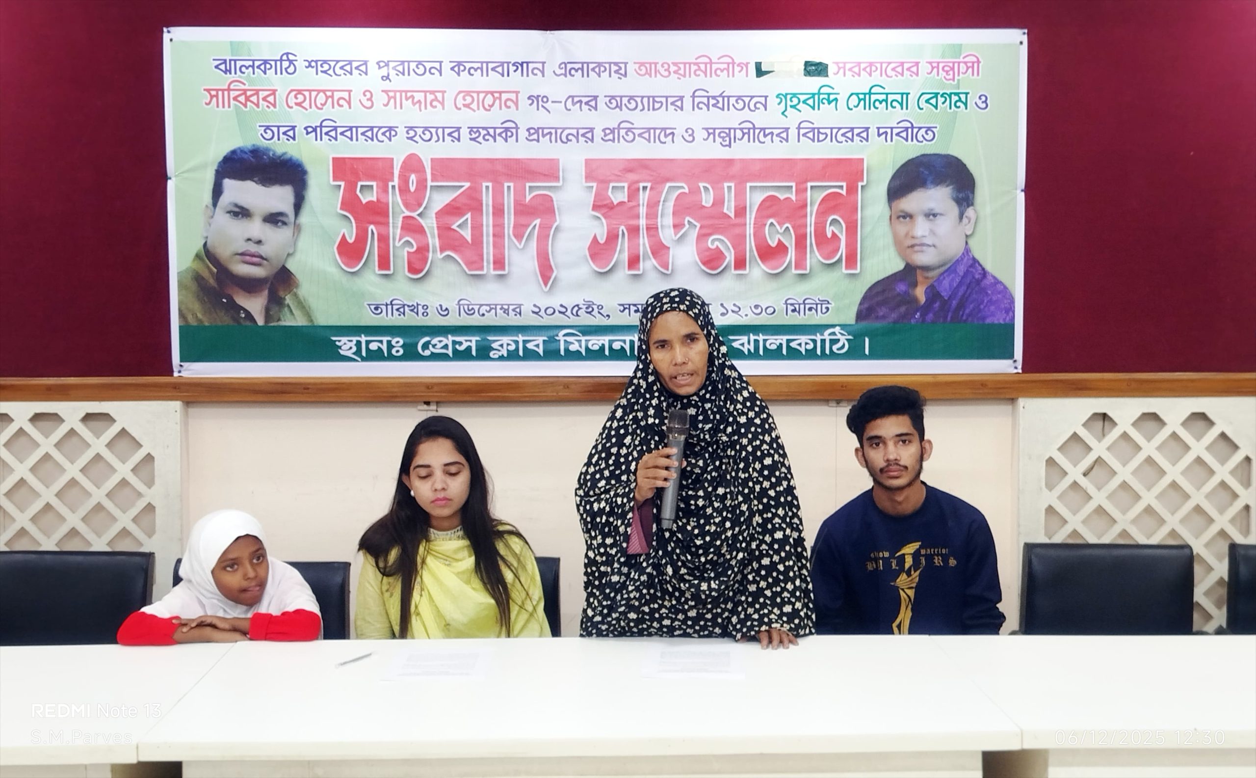 ঝালকাঠি শহরের পুরাতন কলাবাগান এলাকায় নারী উদ্যোক্তা সেলিনা বেগমের ওপর হামলা, শ্লীলতাহানি চেষ্টা, লুটপাট ও হত্যার হুমকির অভিযোগ উঠেছে স্থানীয় প্রভাবশালী ছাব্বির হোসেন ও তার ভাই সাদ্দাম হোসেনের বিরুদ্ধে। শনিবার (৬ ডিসেম্বর) দুপুরে ঝালকাঠি প্রেসক্লাবের কাজী খলিলুর রহমান মিলনায়তনে এক সংবাদ সম্মেলনে এসব অভিযোগ করেন ভুক্তভোগী ওই নারী। এ সময় সংবাদ সম্মেলনে উপস্থিত ছিলেন সেলিনা বেগমের মেয়ে জান্নাতুল ফেরদৌসী কবিতা, ছেলে গোলাম কিবরিয়া বাপ্পি এবং নাতি তানহা।