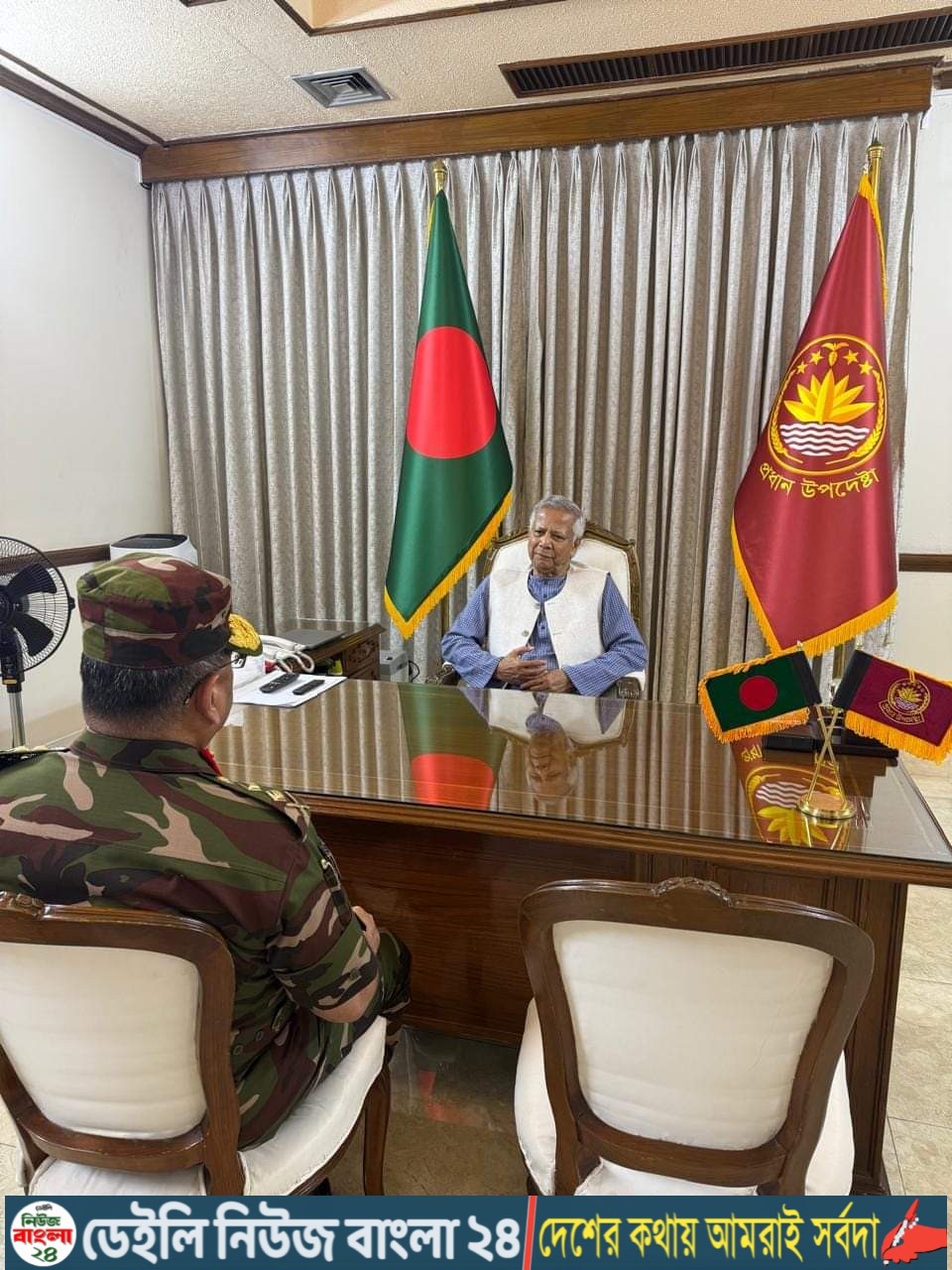 গণপ্রজাতন্ত্রী বাংলাদেশের অন্তর্বর্তীকালীন সরকারের মাননীয় প্রধান উপদেষ্টা প্রফেসর ড. মুহাম্মদ ইউনূস এর সাথে আজ (১৩ অক্টোবর ২০২৪) সৌজন্য সাক্ষাৎ করলেন সেনাবাহিনী প্রধান জেনারেল ওয়াকার-উজ-জামান, ওএসপি, এসজিপি, পিএসসি। সাক্ষাতকালে সেনাবাহিনী প্রধান কুশলাদি বিনিময়ের পাশাপাশি সেনাবাহিনীর চলমান কার্যক্রম সম্পর্কে মাননীয় প্রধান উপদেষ্টাকে অবহিত করেন। এসময় মাননীয় প্রধান উপদেষ্টা সেনাবাহিনী প্রধানকে প্রয়োজনীয় দিকনির্দেশনা প্রদান করেন।